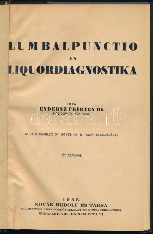 Dr. Endersz Frigyes: Lumbalpunctio és liquordiagnostika. Dr. Reuter Camillo előszavával. Bp., 1935, Novák Rudolf és Társa (Kaposvár, Szabó Lipót-ny.), 111 p. Átkötött félvászon-kötésben, a címlapon kis szakadással.