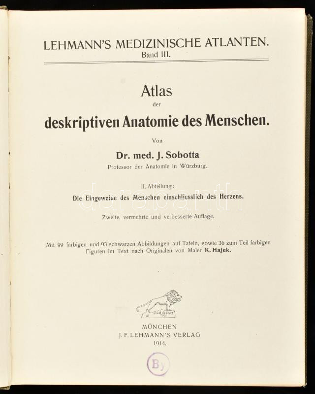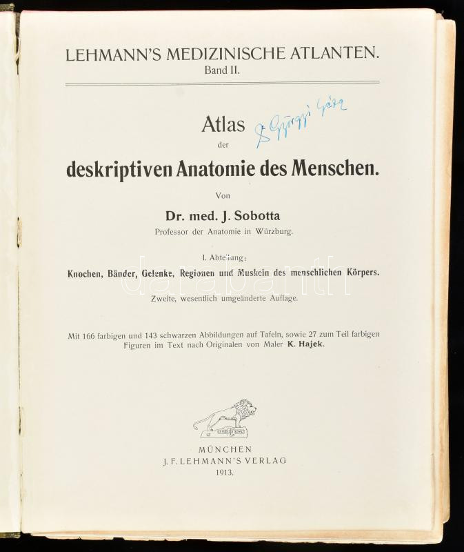Dr. Joh[annes] Sobotta : Atlas der deskriptiven Anatomie des Menschen. I-II. Abtheilunge. I. Abtheilung: Knochen, Bänder, Gelenke, Regionen und Muskeln des menschlichen Körpers. II. Abtheilung: Die Eingeweide des Menschen einschliesslich des Herzens. Lehmann's Medizinische Atlanten II-III. Bande. Münhcen, 1913-1914., J. F. Lehmann's Verlag, VIII+264+15 p.+1-4 t.;VIII+265-445+16 p.+5-20 t. A mű III. kötetben teljes. Zweite Auflage. Gazdag képanyaggal illusztrált. Német nyelven. Kiadói aranyozott fél és egészvászon-kötésben, az I. kötet: kopott borítóval, a gerince sérült, laza, kissé sérült fűzéssel, kijáró lapokkal, kissé megviselt állapotban. a II. kötet kopott borítóval. Dr. Györgyi Géza (1900-1975) radiológus, osztályvezető főorvos, röntgen-laboratórium vezető főorvos, a Magyar Orvosok Röntgen Egyesületének főtitkára, egyetemi magántanár autográf névbejegyzésével!