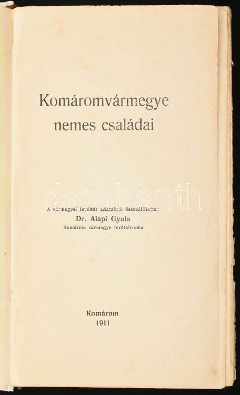 Alapi Gyula: Komáromvármegye nemes családai. Komárom, 1911, Spitzer Sándor, VI+2+308 p. Átkötött kartonált papírkötés, kissé kopott, kissé foltos borítóval.