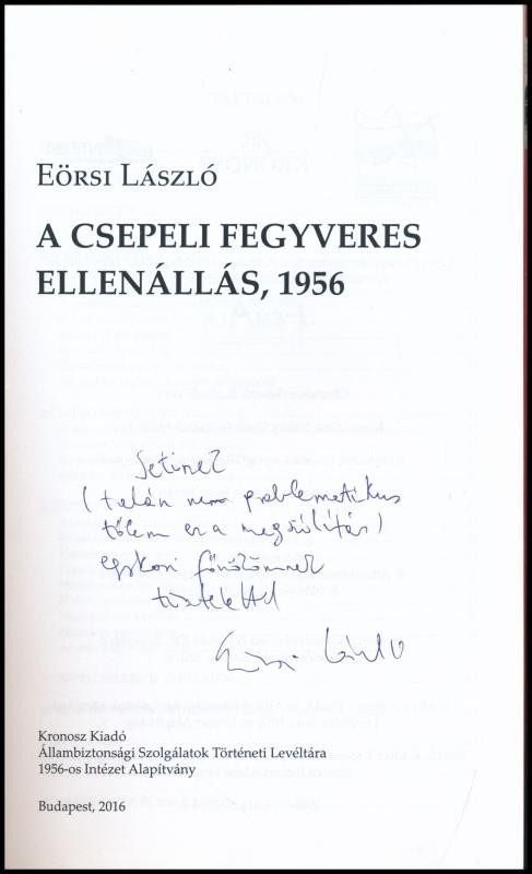Eörsi László: A csepeli fegyveres ellenállás, 1956. A szerző, Eörsi László (1955-) történész által DEDIKÁLT példány! Bp., 2016, Kronosz, Állambiztonsági Szolgálatok Történeti Levéltára, 1956-os Intézet Alapítvány. Fekete-fehér képekkel gazdagon illusztrált. Kiadói papírkötés.