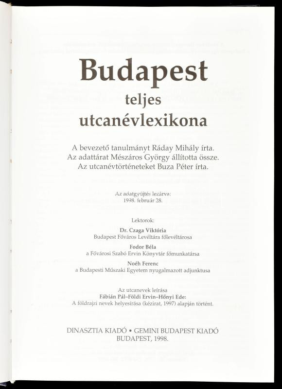 Ráday Mihály - Mészáros György - Buza Péter: Budapest teljes utcanévlexikona. Bp., 1998, Dinasztia - Gemini. Kiadói kartonált papírkötés.
