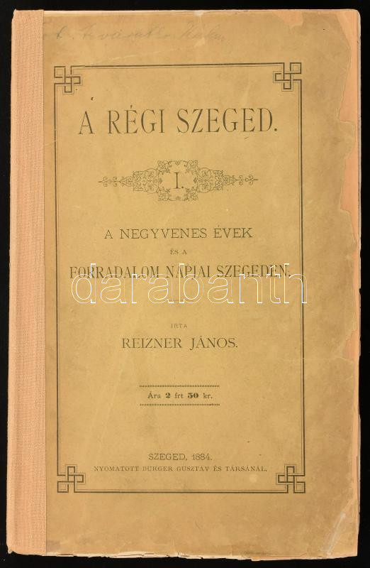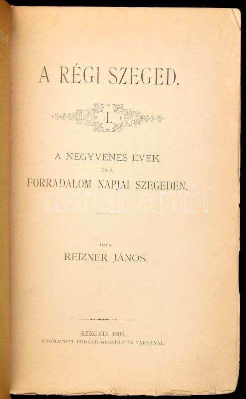 Reizner János: A régi Szeged. I. köt.: A negyvenes évek és a forradalom napjai Szegeden. Szeged, 1884, Burger Gusztáv és Társa, VII+319 p. + 1( kihajtható melléklet (kézirat-másolat) t. Kiadói papírkötés, javított, pótolt borítóval.