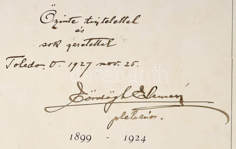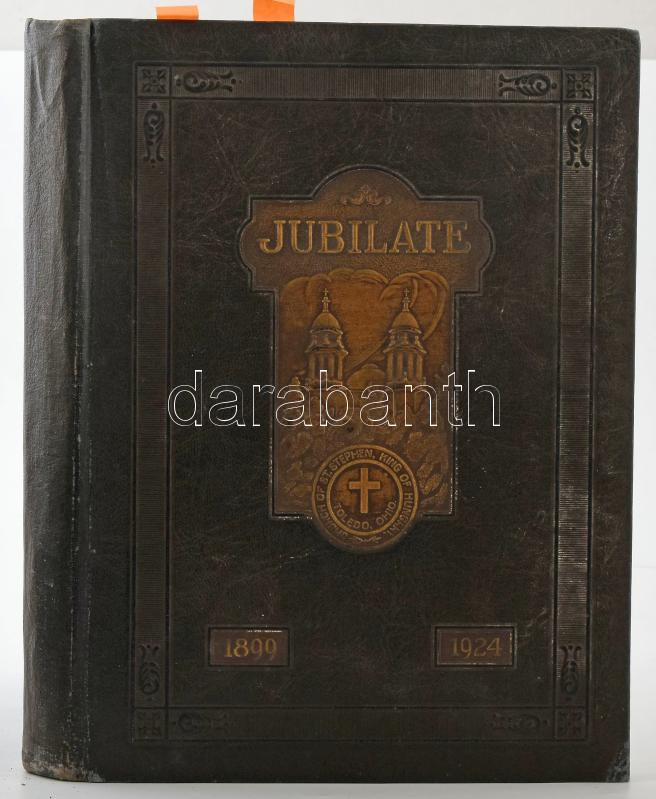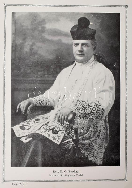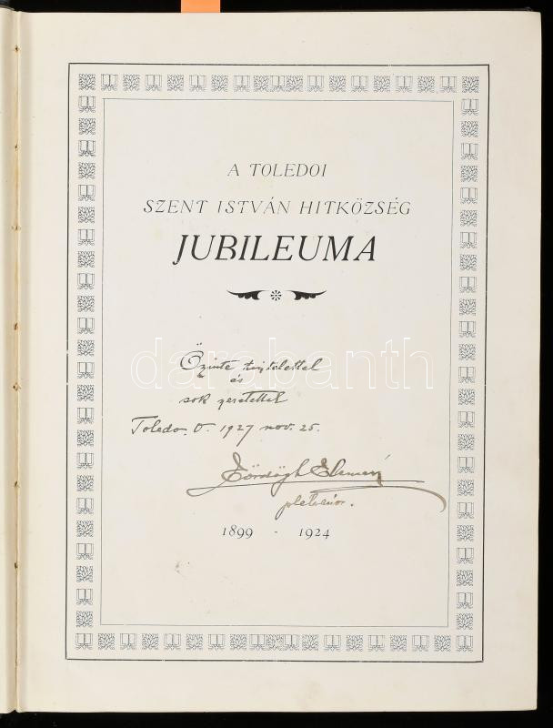 A Toledoi Szent István Hitközség jubileuma. 1899-1924. Toledo, 1924, ny.n., 189+(2) p. Fekete-fehér fotókkal gazdagon illusztrálva. Magyar és angol nyelven. Kiadói aranyozott, dombornyomott egészvászon-kötés, kissé kopott borítóval, sérült, ragasztott fűzéssel, egy lapon kisebb szakadással, néhány folttal. Eördögh Elemér (1875-1955) pápai prelátus, a Toledoi (Ohio, USA) Szent István Magyar Hitközség plébánosa által DEDIKÁLT példány.
