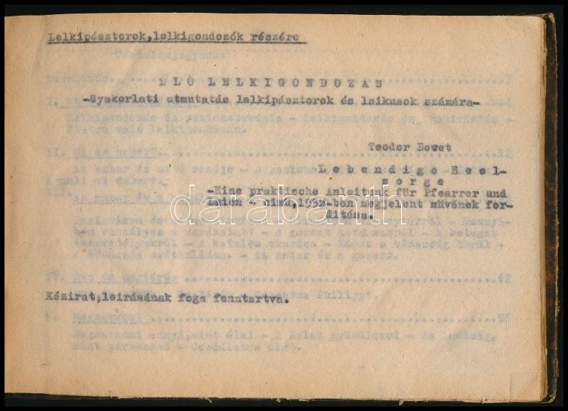 Beschreibung: ÉlÅ‘ lelkigondozás. Gyakorlati útmutatás lelkipásztorok és laikusok részére. (Theodor Bovet: Lebendige Seelsorge - Eine praktische Anleitung für Pfarrer und Laien c., 1952-ben megjelent művének fordÃtása. Kézirat.) H.n., é.n., k.n., 197 p. Félvászon-kötésben, kissé kopott borÃtóval.