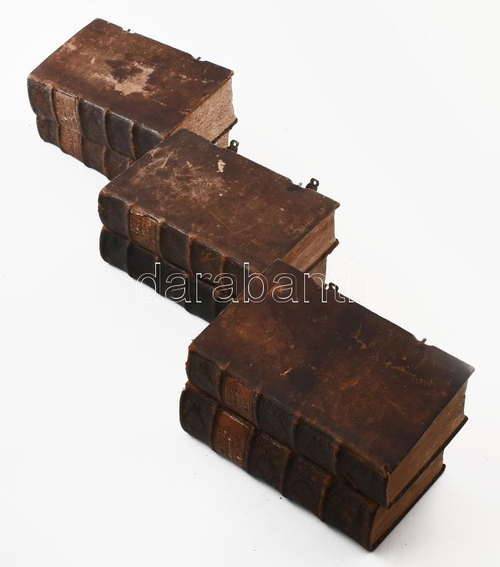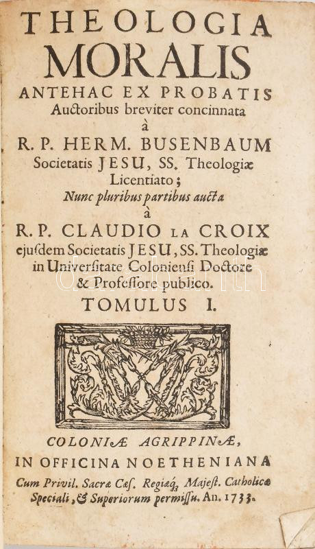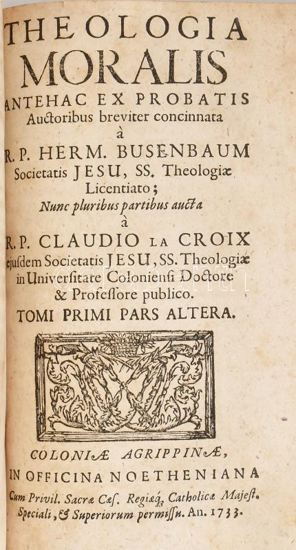 Hermann Busenbaum (1600-1668): Theologia Moralis. Antehac ex probatis. Auctoribus breviter concinnata. Tom. I.,III., V.,VII-IX.: Tomulus I. Hozzákötve Tomi Primi Pars Altera.; Tom. III. (Címlaphiánnyal (?)); Tomuli V. Pars Prima, Pars Secunda. (A kötetben szúette lyukakkal a lapokon.); Tomulus VII.; Tomulus VIII et Ultiumus.; Tomulus. IX.: Index Locupletissimus. Resolutionum omnium, quae continentur, tam in Medullla.; Coloniae Agrippina [Köln], 1733-1724-1720, In Officina Noetheniana - Servatium Noethen, 516+20+8+224 p.;2+848+6 p.; 8+298+6+16+449+12 p.; 16+881-1511+48 p.; 24+983 p.; 8+1014+1 p. Latin nyelven. Korabeli egészbőr-kötések, kopott borítókkal, foltos lapokkal, a III. kötetben címlaphiánnyal (?), az V. kötetben szúette lyukakkal, az I. kötetben possessori bejegyzéssel.