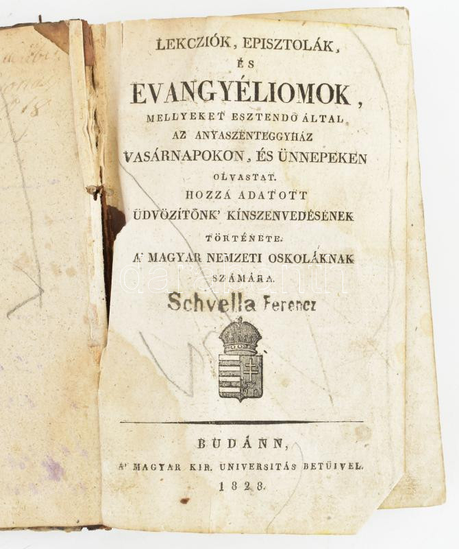 Lekcziók, episztolák és evangyéliomok, mellyeket esztendő által az Anyaszentegyház vasárnapokon és ünnepeken olvastat : hozzá adatott Üdvözítőnk kínszenvedésének története : a magyar nemzeti oskoláknak számára Buda. 1828. M. kir Universitas 215 p. + 7 sztl lev. utolsó lap hiányzik. Sérült megviselt félbőr kötésben