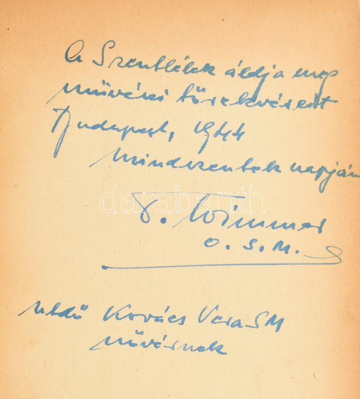 Wimmer M. Anzelm: Éljünk a Szentlélekben. (A Szentlélek aszketikája). I. kötet. Kovács Vera rajzaival. Bp., 1944, Szociális Missziótársulat, 180 p. Aranyozott gerincű egészvászon-kötésben, a borítón némi kopással. A szerző által Kovács Vera nővér, a könyv illusztrátora részére DEDIKÁLT példány.