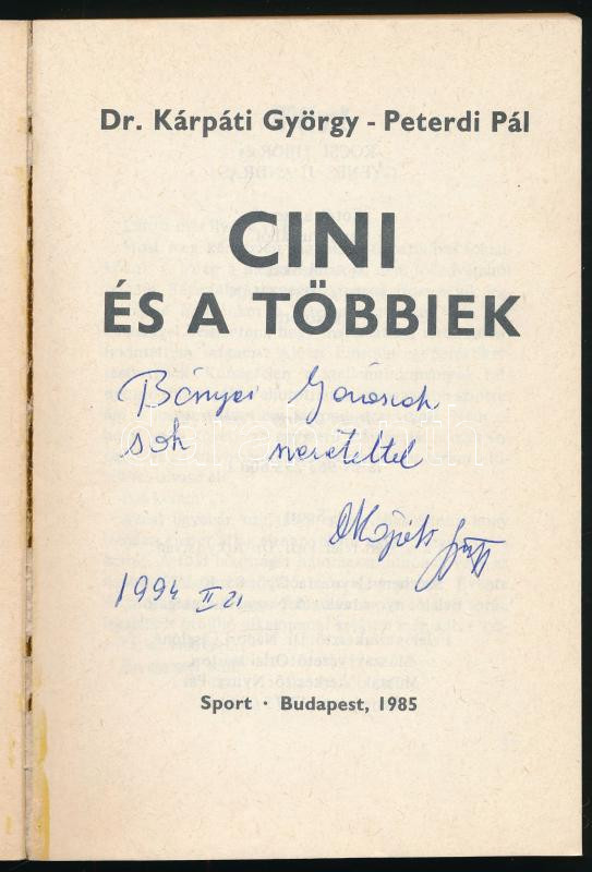 Dr. Kárpáti György - Peterdi Pál: Cini és a többiek. Bp., 1985, Sport. Kiadói papírkötés, a borítón kopással, kis foltokkal. A könyv egyik szerzője, Kárpáti György (1935-2020) olimpiai bajnok vízilabdázó, edző által DEDIKÁLT példány.
