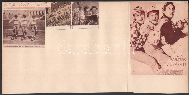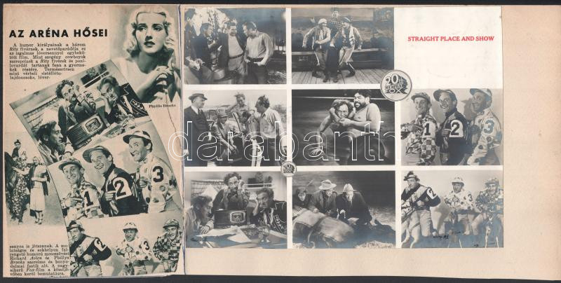 cca 1938 ,,Az aréna hÅ‘sei - Straight Place and Show" cÃmű amerikai film nyolc jelenete (fÅ‘szereplÅ‘k a Ritz fivérek), 1 db vintage produkciós filmfotó, ezüst zselatinos fotópapÃron, Pánczél György (1920-?) filmtörténész hagyatékából (film- és szÃnházifotó-gyűjteményébÅ‘l), rajzlapra felragasztva, + egy magyar nyelvű elÅ‘zetes újsághÃr - képekkel illusztrálva - a filmrÅ‘l, 18,5x24 cm