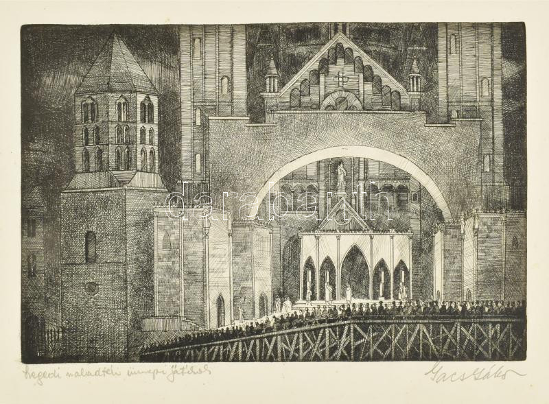 Beschreibung: Gacs Gábor (1930-2019):Szegedi szabadtéri ünnepi játékok Rézkarc, papír, jelzett, 20x30 cm