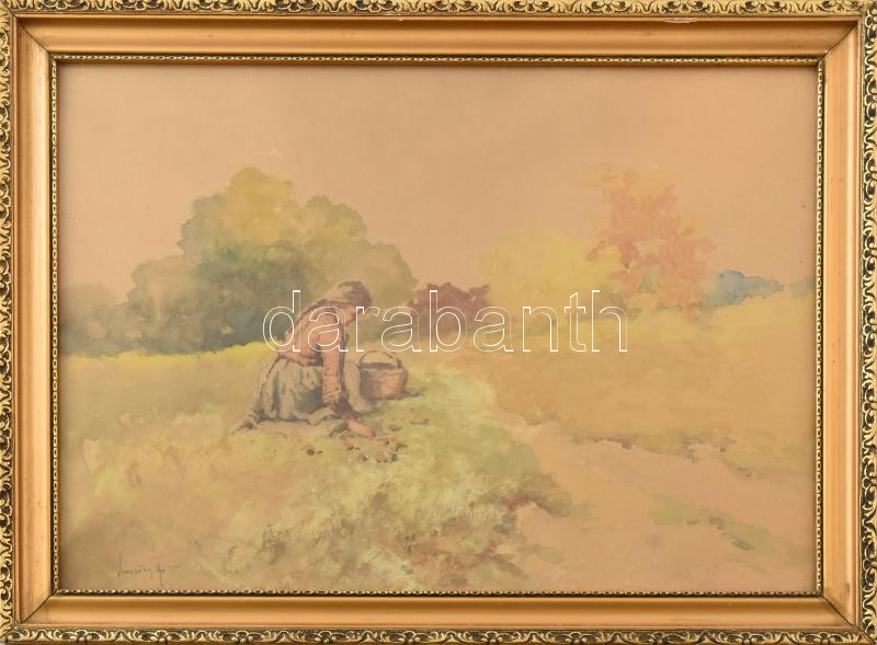 Beschreibung: Neogrády Antal (1861-1942): Lány a réten. Akvarell, papír, jelezve balra lent. Üvegezett fakeretben, 29,5×40 cm