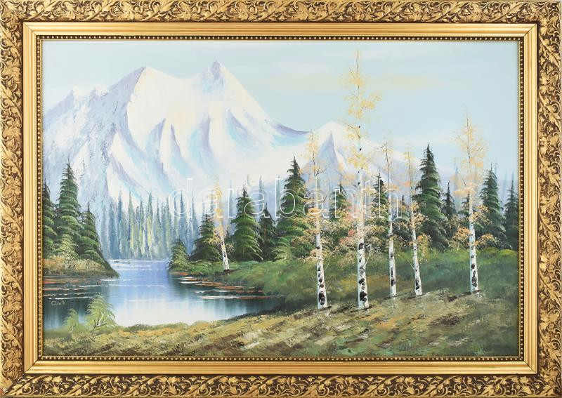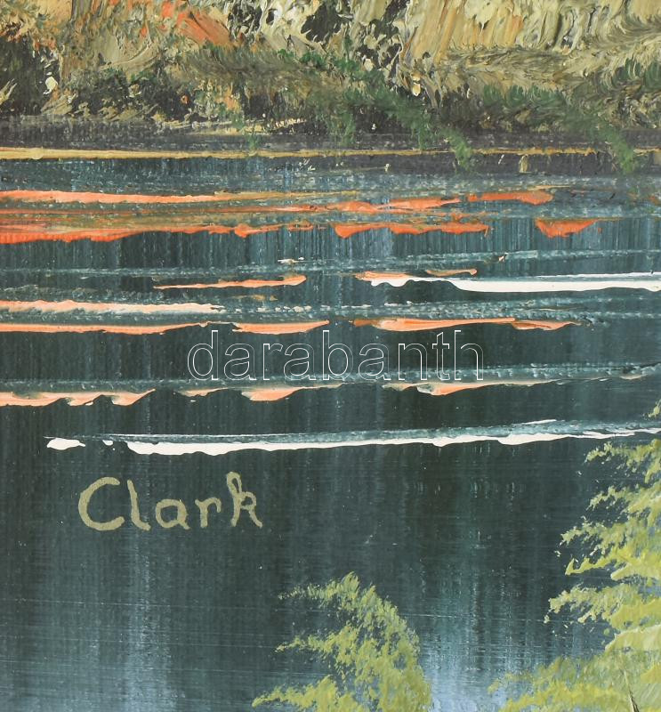 Clark jelzéssel: Hegyvidéki táj. Olaj, vászon. Dekoratív, sarkában kissé sérült fakeretben. 60x90 cm KIZÁRÓLAG SZEMÉLYES ÁTVÉTEL, NEM POSTÁZZUK! / ONLY PERSONAL COLLECTION AT OUR OFFICE!
