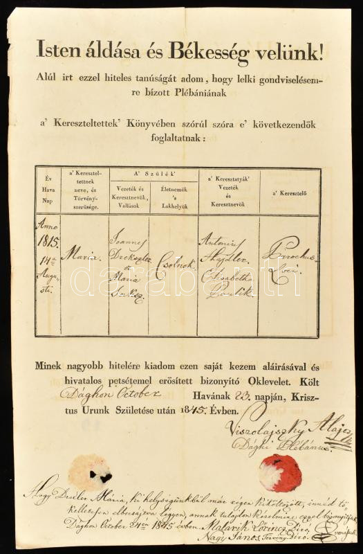 Beschreibung: 1845 Dág Keresztlevél sérült viaszpecséttel, kis hiánnyal