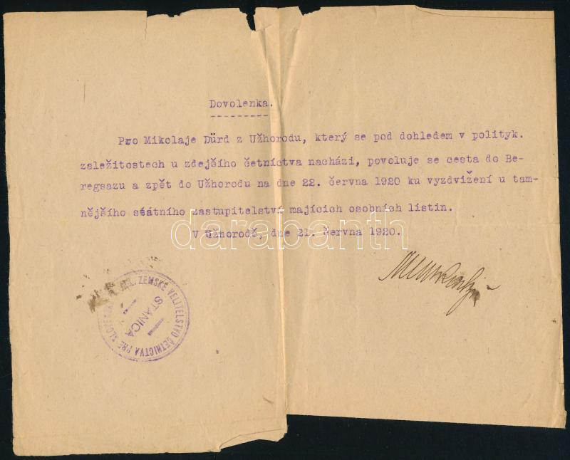 1920 Ungváron cseh nyelven kiállított utazási igazolvány magyar személ... https://www.darabanth.com/de/451-Fernauktion/451.0/Kunst-Dokumente-andere-Sammelgebiete/Dokument~500022/1920-Ungvaron-cseh-nyelven-kiallitott-utazasi-igazolvany-magyar-szemely-reszere~II3004338