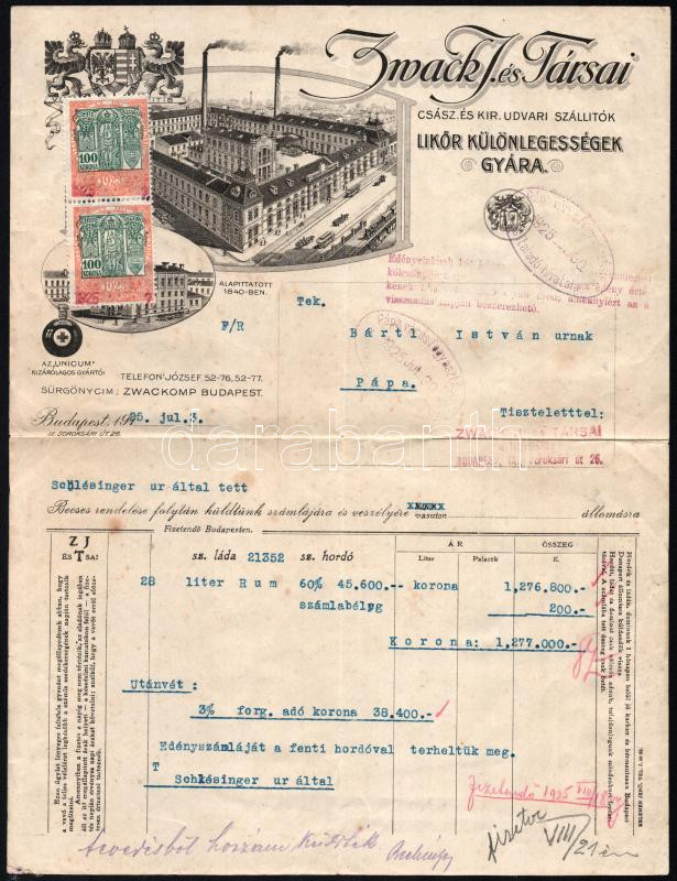 Beschreibung: 1925 Zwack J. és Társai csász. és kir. udvari szállítók díszes fejléces számla, rajta a gyár látképe, valamint Osztrák-Magyar Monarchia címere