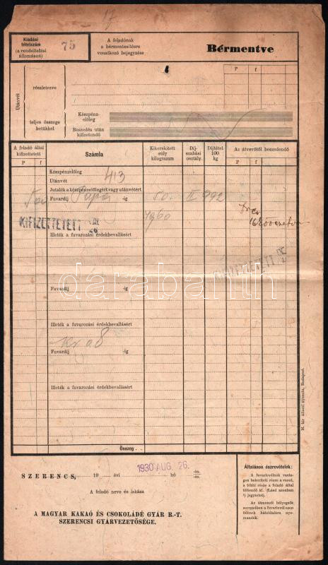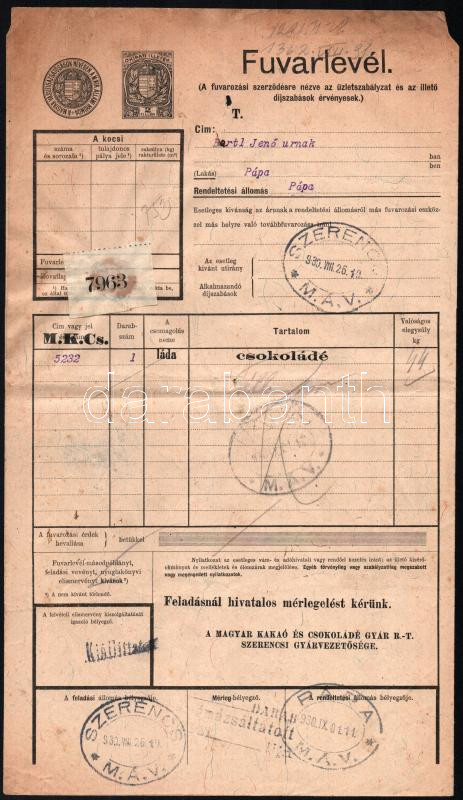 Beschreibung: 1930 Szerencs, A Magyar Kakaó és Csokoládé Gyár R.T. Szerencsi Gyárvezetősége vasúti fuvarlevél - 1 láda/44kg csokoládéról