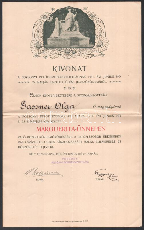 1911 Pozsony Kivonat a Petőfi szoborbizottság ülés jegyzőkönyvéből. Ma... https://www.darabanth.com/de/451-Fernauktion/451.0/Kunst-Dokumente-andere-Sammelgebiete/Drucksachen~1000005/1911-Pozsony-Kivonat-a-Petofi-szoborbizottsag-ules-jegyzokonyvebol-Marguerita-unnep-dicse~II3001575