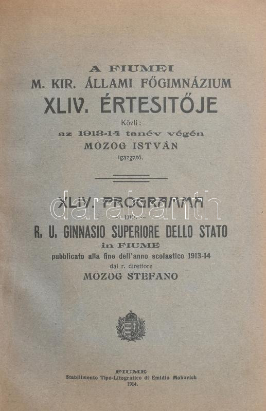 1913-17 A Fiuemi m. kir. állami főgimnázium értesítői. 4 db, az utolsó... https://www.darabanth.com/de/451-Fernauktion/451.0/Kunst-Dokumente-andere-Sammelgebiete/Drucksachen~1000005/1913-17-A-Fiuemi-m-kir-allami-fogimnazium-ertesitoi-4-db-az-utolso-magyar-nyelvuek-Magy~II3003858