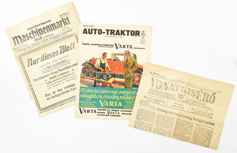 cca 1917-1934 össz. 3 db műszaki és vasút témájú lap és reklámnyomtatvány: Auto-taktor, 1932. szept. hó 9. sz., a Tudor Accumulátorgyár Varta különszáma, javított; 1917 Österreichisch-Ungarischer Maschinenmarkt lapszáma, német nyelven, rengeted hirdetéssel; Vonatkísérő, 1934. mov.