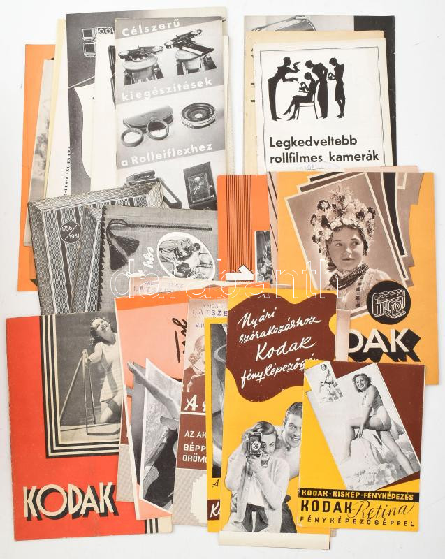 cca 1930-1940 Vegyes fotós prospektus tétel, közte 10 db Kodak, 1 db Zeiss Ikonta,5 db Voigtländer, 3 db Rollflex - Rolleicord, 2 db MOM, összesen 24 db. Változó állapotban.