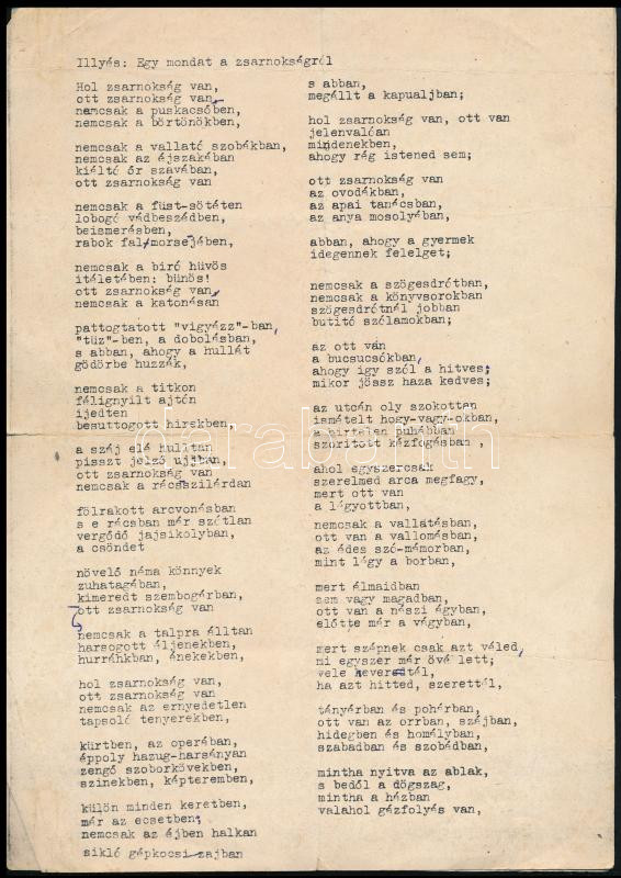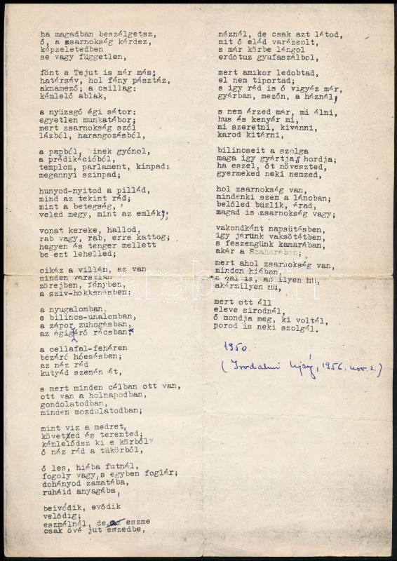 cca 1950 Illyés Gyula: Egy mondat a zsarnokságról című versének gépelt... https://www.darabanth.com/de/451-Fernauktion/451.0/Kunst-Dokumente-andere-Sammelgebiete/Drucksachen~1000005/cca-1950-Illyes-Gyula-Egy-mondat-a-zsarnoksagrol-cimu-versenek-gepelt-valtozata~II3004506