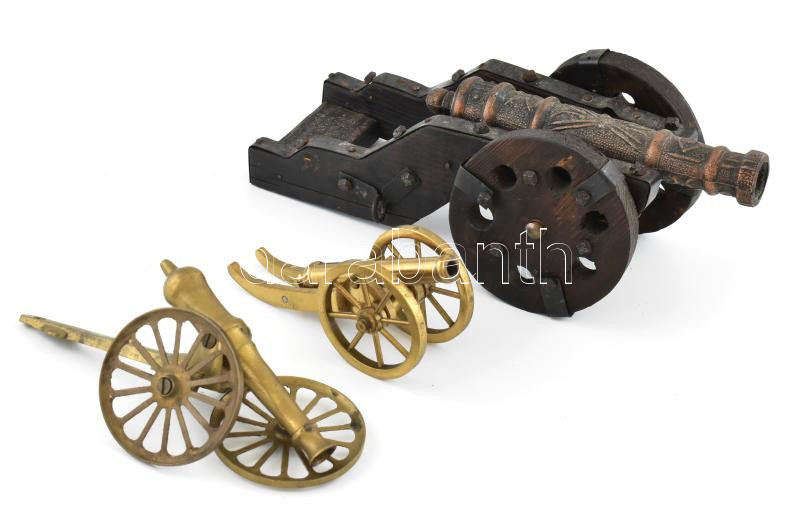 Beschreibung: 3 db ágyú. Réz, bronz, faragott fa, 19-30 cm
