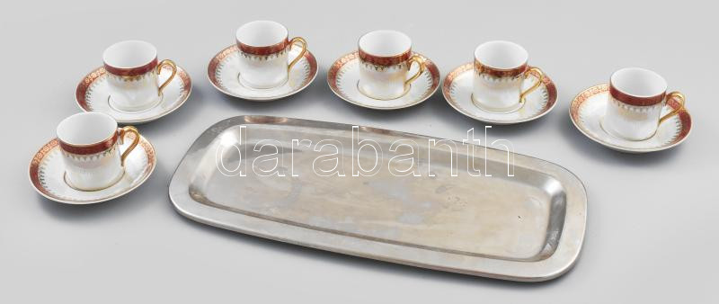 Beschreibung: 6 db német mokkás csésze + alj. Matricás, jelzett, hozzá egy fém tálca 18x35 cm