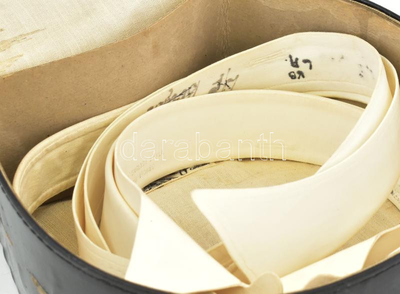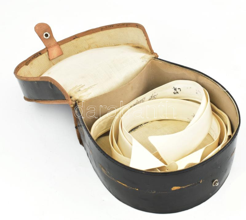 Beschreibung: J.M.S.L. Joss keménygallértok, benne 4 különféle gallérral, műbőr borítású vászondoboz, kopott, belül foltos, 18x19x8 cm