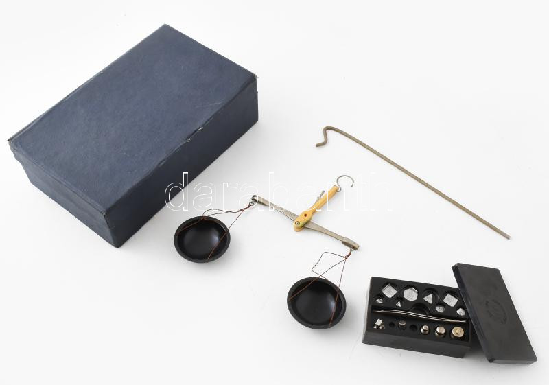 Beschreibung: Orosz ékszerész mérleg, dobozban