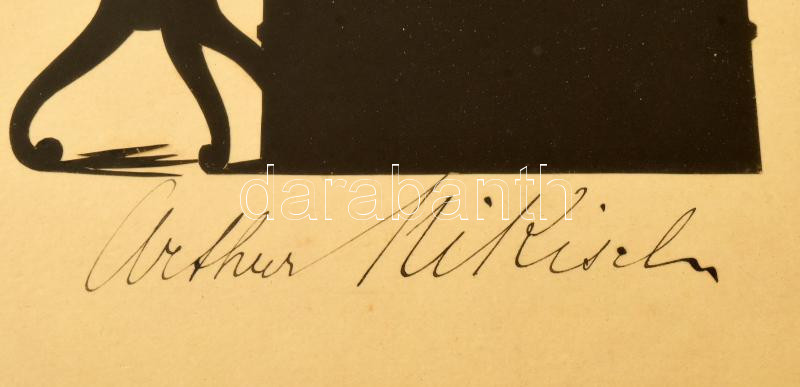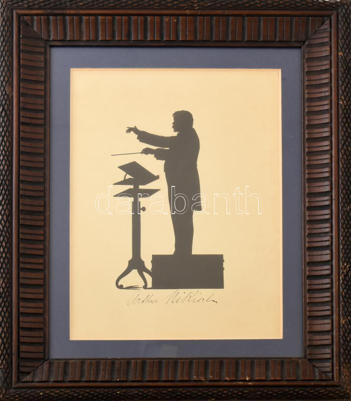 Beschreibung: Nikisch Artúr (1855-1922) magyar karmester aláírása egy őt ábrázoló árnyképen, üvegezett keretben, paszpartuban, keret: 46x36 cm