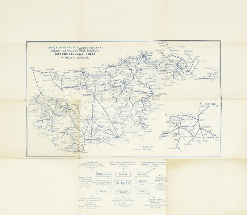 cca 1940 Magyarország vasúti térképe a visszatért felvidéki és kárpotéaljai területekkel, a hivatalos menetrendkönyv melléklete, Balatoni vasúti és hajózási térképpel, 1:1,200.000, valamint Budapest pályaudvarainak vázlatos térképével, tervezte Tallián Ferenc, a hátoldalán a MÁVAUT autobusz-vonalak átnézeti térképével, 1:1,200.000, kiadja: Bp., Magyar Földrajzi Intézet Rt., hajtott, 51x56 cm
