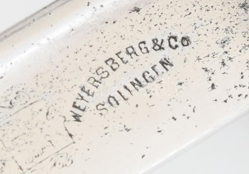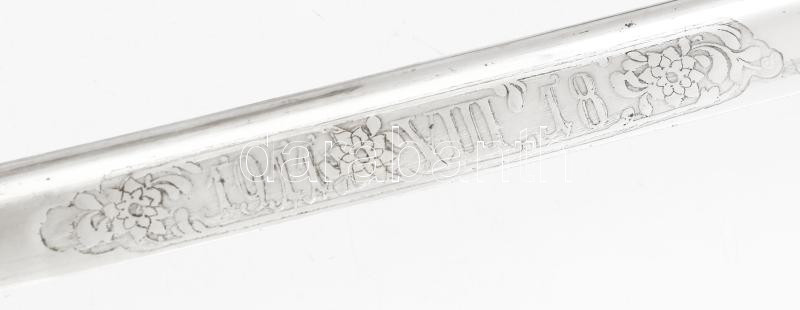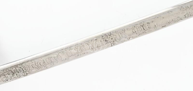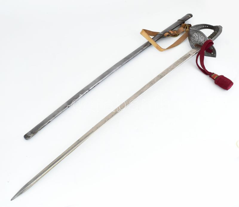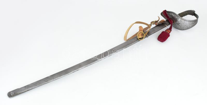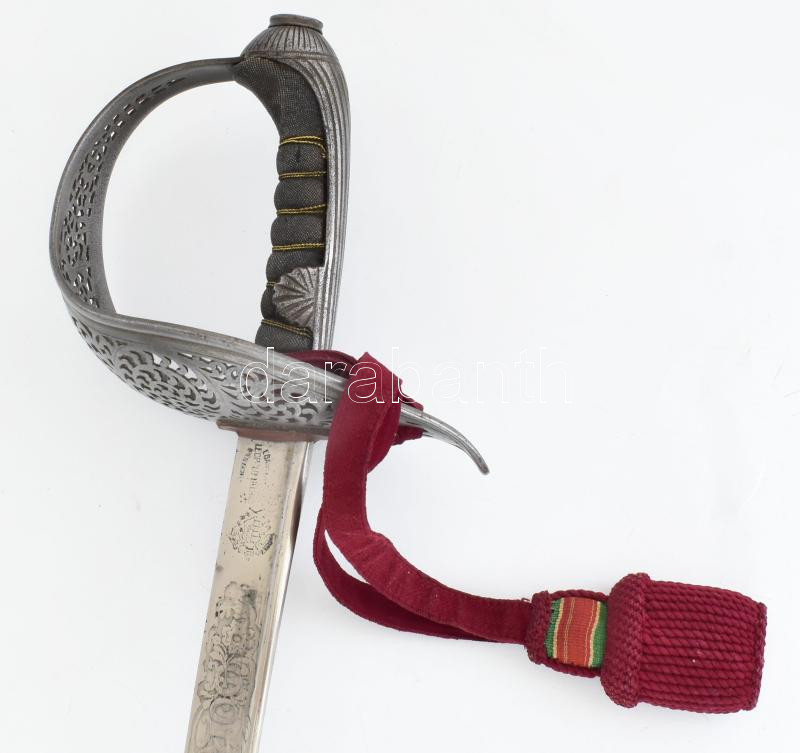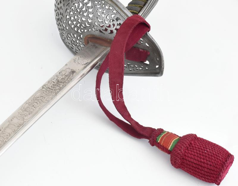 1904M lovassági tiszti szablya. Extra változat, gazdagon díszített, egyedi, áttört mintás kosárral, a pengén maratott felirattal ("Mortem asoae fidelis") és dátummal (1911.VIII.18.) Jelzett, a penge egyik oldalán Weyersberg & Co. Solingen, a másikon Leopold Ullrich Wien jelzéssel és koronás magyar címerrel. Fém hüvellyel, nem eredeti kardbojttal és csatlékkal. Korának megfelelő állapotban, h: 94 cm