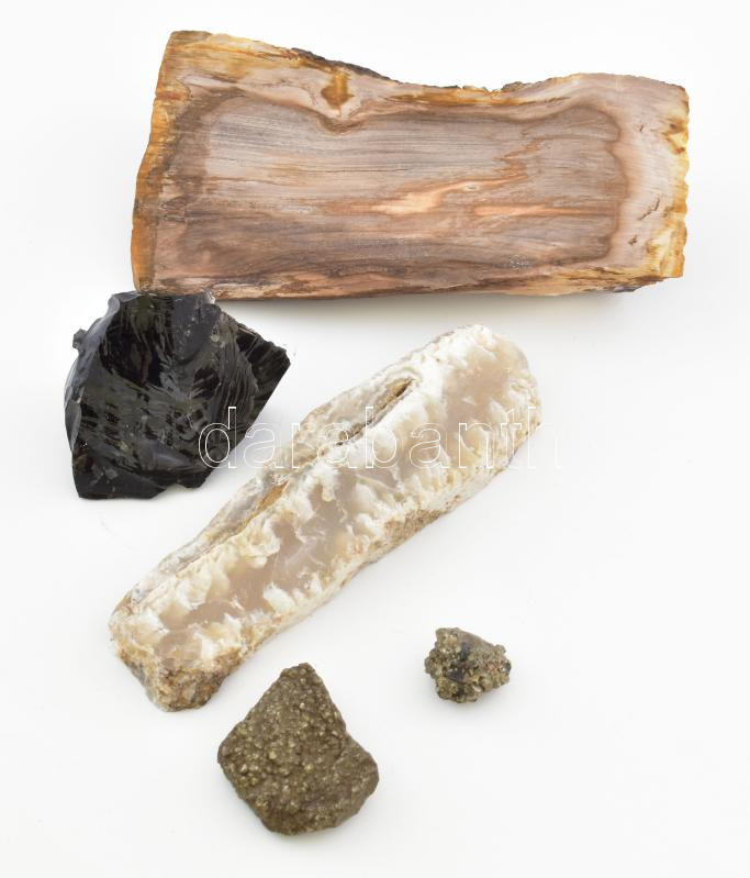 Egy doboznyi ásvány: nagy megkövesedett-szépen csiszolt fa, egyik oldalán csiszolt hosszúkás kalcit, 2 db Pirit,Obszidián.