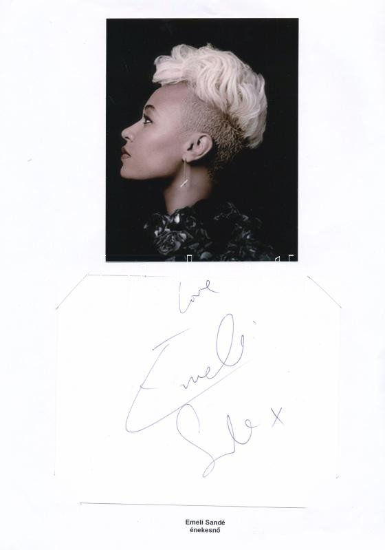 Beschreibung: Emeli Sandé (1987-) brit énekesnő és dalszerző aláírása papírlapon