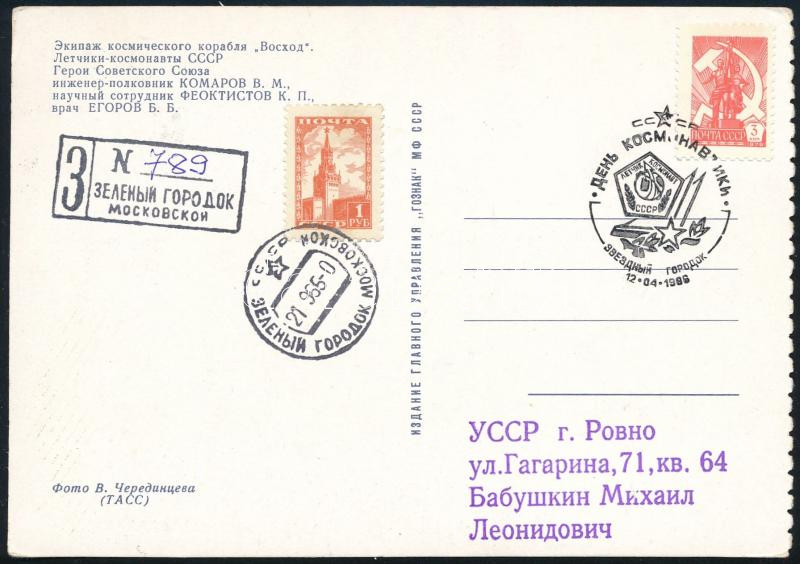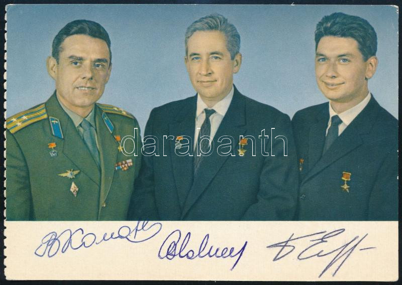 Vlagyimir Komarov (1927-1967), Konsztantyin Feoktyisztov (1926-2009) és Borisz Jegorov (1937-1994) orosz űrhajósok aláírásai Voszhod képeslapon /