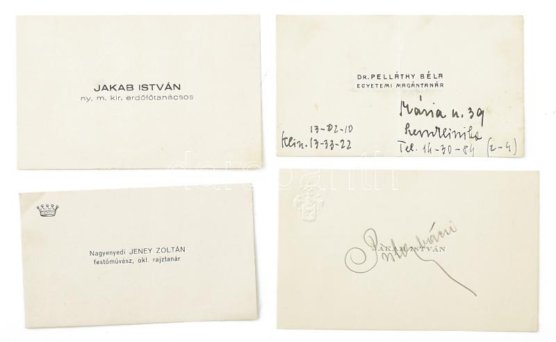 cca 1935 4 db megírt névjegy: Dr. Pelláthy Béla, Jakab István (2×), Na... https://www.darabanth.com/de/451-Fernauktion/451.0/Kunst-Dokumente-andere-Sammelgebiete/Signatur~500024/cca-1935-4-db-megirt-nevjegy-Dr-Pellathy-Bela-Jakab-Istvan-2C397-Nagyenyedi-Jeney-Zoltan~II3003747