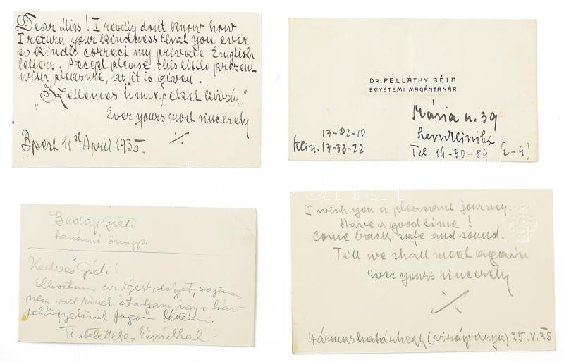 Beschreibung: cca 1935 4 db megírt névjegy: Dr. Pelláthy Béla, Jakab István (2×), Nagyenyedi Jeney Zoltán