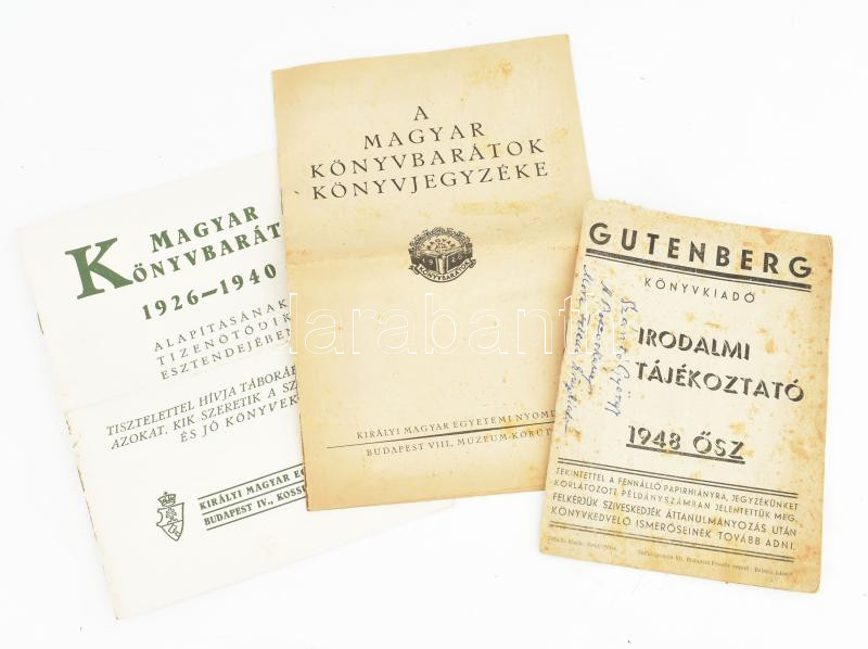 1926-1950 3 db könyvjegyzék: Magyar könyvbarátok könyvjegyzéke, Gutemb... https://www.darabanth.com/de/451-Fernauktion/451.0/Kunst-Dokumente-andere-Sammelgebiete/Werbungen~500026/1926-1950-3-db-konyvjegyzek-Magyar-konyvbaratok-konyvjegyzeke-Gutemberg-konyvkiado~II2995194