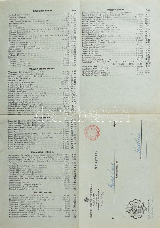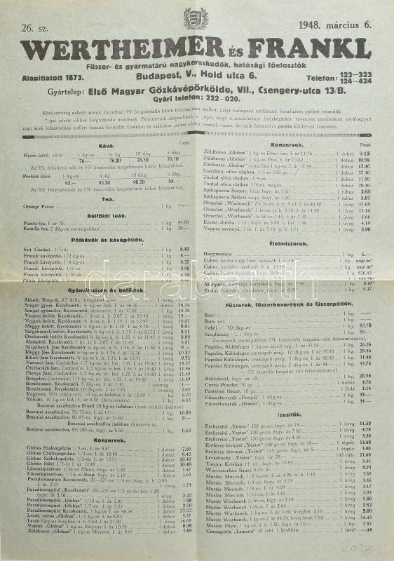 1948 Wertheimer és Frankl fűszer- és gyarmatárú nagykereskedő árjegyzé... https://www.darabanth.com/de/451-Fernauktion/451.0/Kunst-Dokumente-andere-Sammelgebiete/Werbungen~500026/1948-Wertheimer-es-Frankl-fuszer-es-gyarmataru-nagykereskedo-arjegyzek-26-sz-1948-mar~II3003043