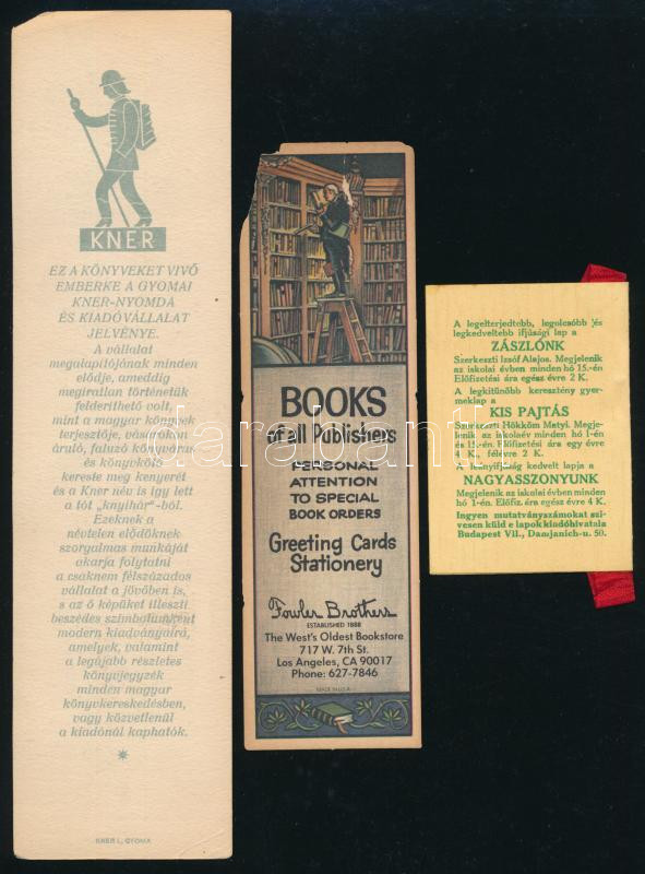 3 db régi könyvjelző, közte Gyomai Kner Nyomda reklámos, vegyes állapo... https://www.darabanth.com/de/451-Fernauktion/451.0/Kunst-Dokumente-andere-Sammelgebiete/Werbungen~500026/3-db-regi-konyvjelzo-kozte-Gyomai-Kner-Nyomda-reklamos-vegyes-allapotban-7x4-5-cm-es-20-5x~II2956842