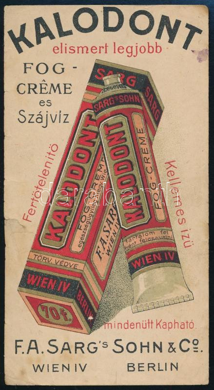 cca 1910-1920 Kalodont fogkrém és szájvíz, színes litho számolócédula,... https://www.darabanth.com/de/451-Fernauktion/451.0/Kunst-Dokumente-andere-Sammelgebiete/Werbungen~500026/cca-1910-1920-Kalodont-fogkrem-es-szajviz-szines-litho-szamolocedula-kisse-viseltes~II2997693