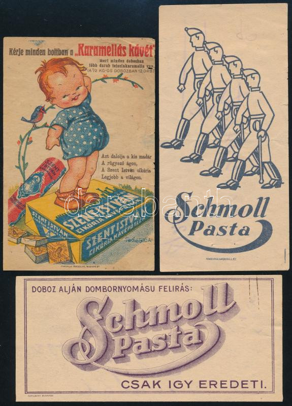 Beschreibung: cca 1920-1940 Szent István Cikóriagyár ,,Karamellás kávé" számolócédula, kissé sérült + 2 db Schmoll Pasta számolócédula (egyik katonai motívumos)