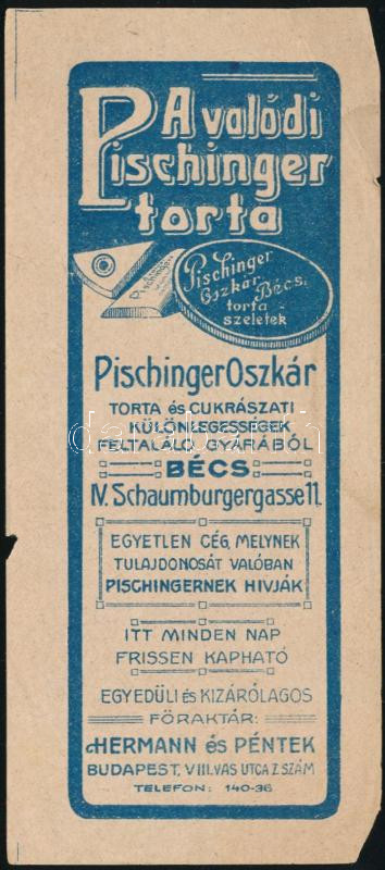 cca 1920 Pischinger Oszkár torta és cukrászati különlegességek számoló... https://www.darabanth.com/de/451-Fernauktion/451.0/Kunst-Dokumente-andere-Sammelgebiete/Werbungen~500026/cca-1920-Pischinger-Oszkar-torta-es-cukraszati-kulonlegessegek-szamolocedula-szelen-aprC3~II2997261