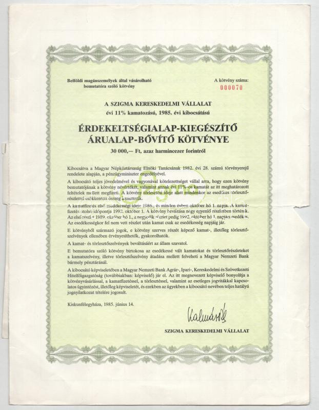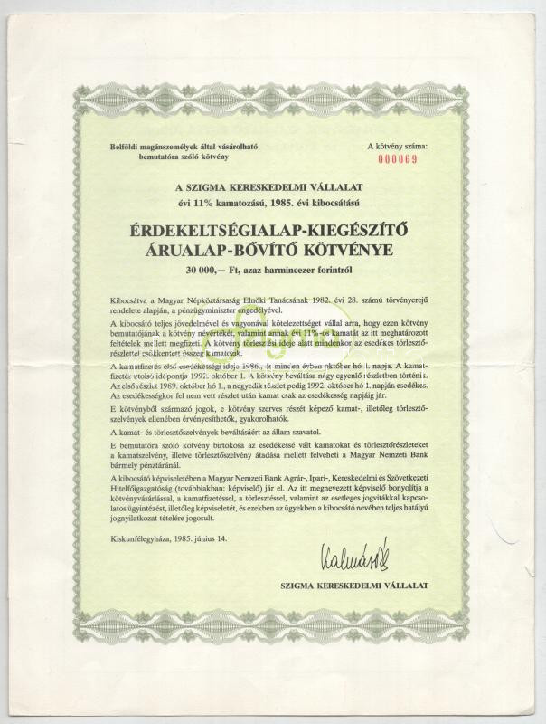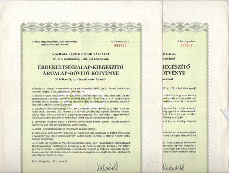 Beschreibung: Kiskunfélegyháza 1985. "A Szigma Kereskedelmi Vállalat érdekeltségialap-kiegészítő árualap-bővítő kötvénye" 30.000Ft-ról (3x), sorszámkövetők T:VF