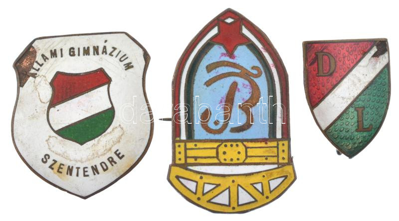 3db-os iskolajelvény-tétel, közte "Állami Gimnázium Szentendre" zománcozott jelvény T:XF,VF zománchiba, tűhiány