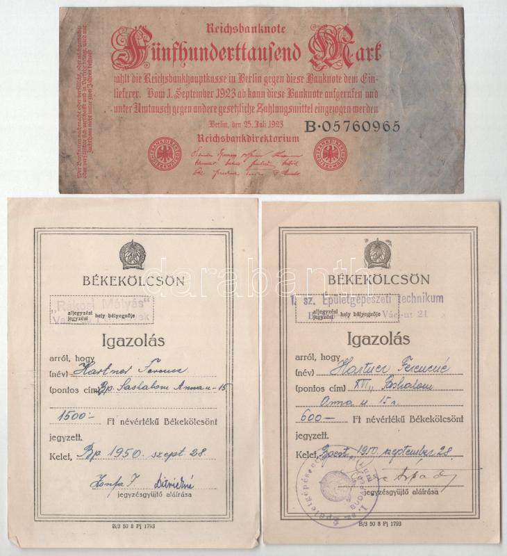 Budapest 1950. 2db névre szóló, kitöltött békekölcsön igazolása a "Rákosi Mátyás Vas és Fémművek" és az "I. sz. Épületgépészeti technikum" jegyzési bélyegzőivel + Németország / Weimari Köztársaság 1923. 500.000M T:AU-VG folt