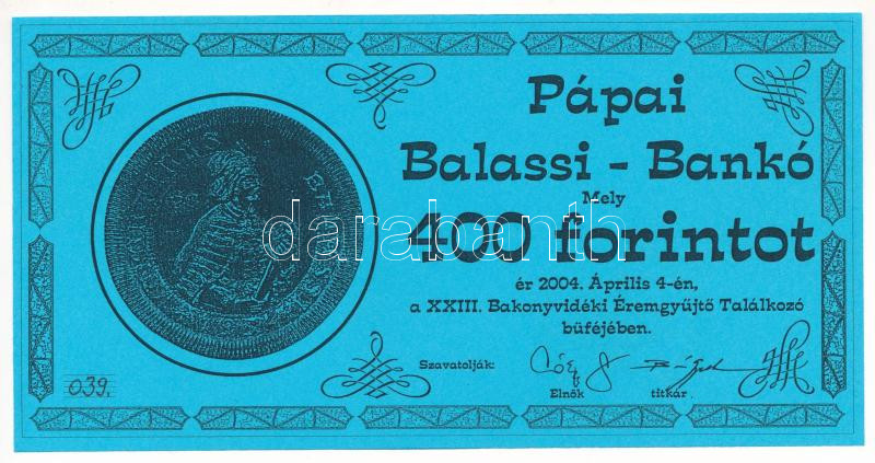 Pápa 2004. "23. Bakonyvidéki Éremgyűjtő Találkozó" 400Ft Bal... https://www.darabanth.com/de/451-Fernauktion/451.0/Numismatik/Notgeld-aus-Papier-und-Metall~1500006/Papa-2004-23-Bakonyvideki-Eremgyujto-Talalkozo-400Ft-Balassi-banko-hatoldalan-MEE-P~II2999982