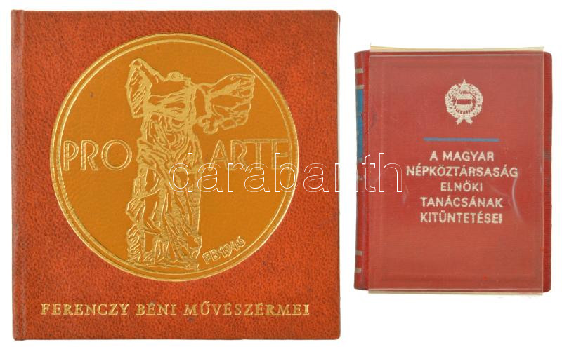 "A Magyar Népköztársaság Elnöki Tanácsának kitüntetései", Budapest, Kossuth Könyvkiadó, 1985. Minikönyv, sorszámozott, "397"-es sorszámmal + M. Várhelyi Vanda: "Pro Arte - Ferenczy Béni Művészérmei". Szentendre, 1980. Minikönyv. Mindkét minikönyv használt, jó állapotban.