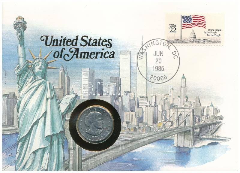Amerikai Egyesült Államok 1979D 1$ Cu-Ni "Susan B. Anthony" felbélyegzett borítékban, bélyegzéssel, német nyelvű leírással T:AU