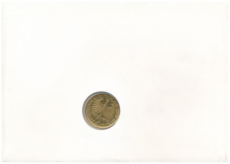 Beschreibung: NSZK 1957J 2M aranyozott Cu-Ni "Max Planck" felbélyegzett borítékon, alkalmi bélyegzéssel T:AU